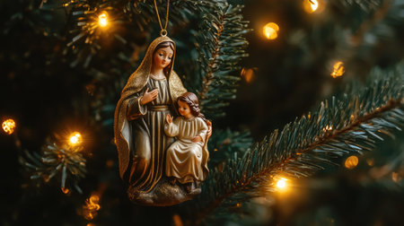 A stunning Christmas ornament depicting the Virgin Mary and Baby Jesus, beautifully hanging from a pine tree adorned with warm lights, symbolizing holiday joy and spirituality.