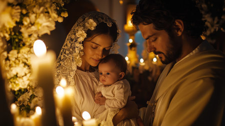 Amidst soft candlelight and fragrant flowers, a couple lovingly embraces their infant, reflecting deep emotions during a spiritual rite. The atmosphere is filled with warmth and devotion.