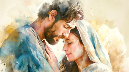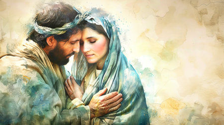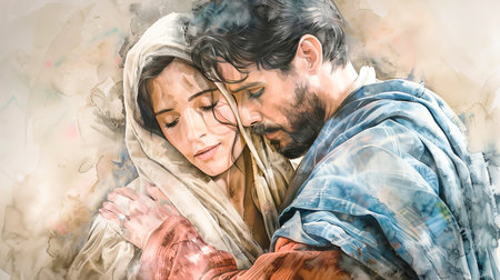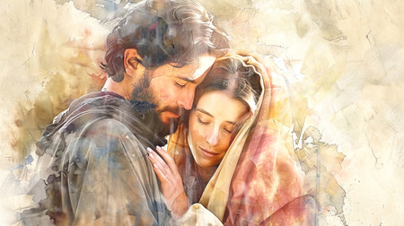 Mary and Joseph share an intimate embrace, conveying deep emotion through soft colors and detailed watercolor, celebrating their bond together.