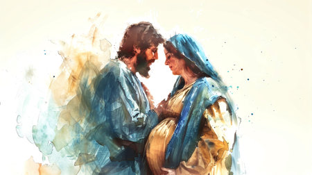 A digital watercolor illustration of Joseph and Mary, Mary with child, in a peaceful moment before their journey to Bethlehem. The serene background and warm colors evoke a sense of divine trust and love as they await the birth of Jesus, with subtle references to the scriptural passages of Matthew and Luke