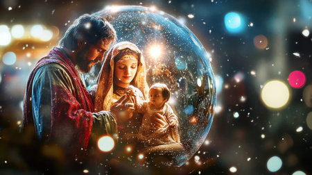 A lovely depiction of a holy family in a snow globe, surrounded by falling snowflakes and an enchanting light, evoking feelings of warmth, family, and festive joy.