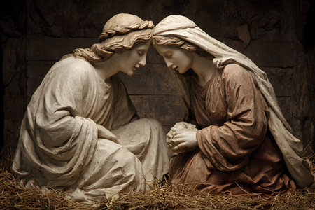 A close-up of classically styled statues of Mary and Joseph, bowed in a moment of peace and prayer, their foreheads touching in humility and devotion.