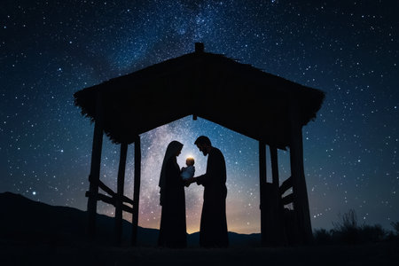 A silhouette of Mary holding baby Jesus, with Joseph standing protectively; glowing starlight filtering through the stable, surrounded by a serene night landscape