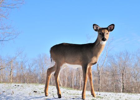 Whitetail deer yearling standing in winter snow.