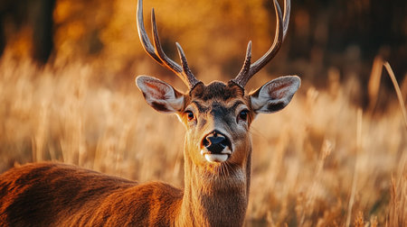 Deer is standing in a field of tall grass. The deer has large antlers and is looking directly at the camera. Concept of wildness and natural beauty, as the deer is in its natural habitat