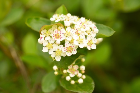 Close up of little white flowers at the tip of a bush branch. Blooming bush with green leaves and white flowers with shallow depth of field and selective focus