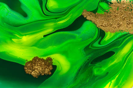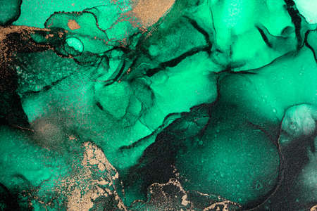 Green and gold marble abstract acrylic background. Marbling artwork texture. Agate ripple pattern. Gold powder.