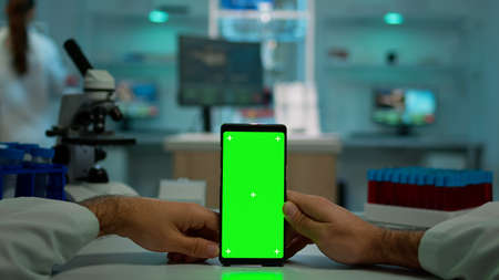 Pov shot of microbiologist holding phone with green chroma key display sitting at desk searching, reading virus symptoms. In background lab researcher analysing vaccine developent examining samples