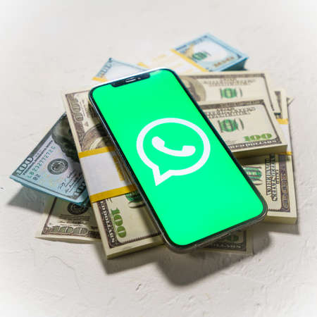 Berlin, Germany - February 02, 2022: Apple iPhone 12 Pro with messenger WhatsApp on the screen and dollar money