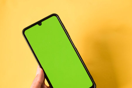 Chroma key on electronic devices, phone and monitor, green screen and hand scrolling through the screen in the absence of light
