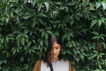 Sensual portrait of young brunette woman among greenery in park or garden. Calm moment. Stylish millennial girl standing in green leaves in city street.