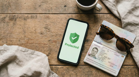 A vpn privacy safety smartphone secure browsing shield icon on screen near passport and coffee on rustic wooden table