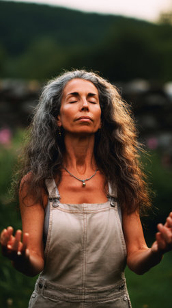 Woman with gray hair sitting outdoors in natural light, eyes closed, wearing a knitted sweater. Captures a moment of calmness, introspection, and emotional depth.