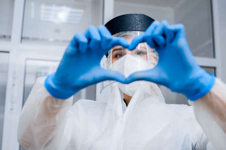 Girl medic in a protective suit and a plastic mask makes hands in the shape of a heart.