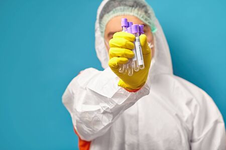 Medical tubes for analysis on coronavirus covid-19. Doctor in protective clothing and respirator mask holds tests on 2019-nCoV. Corona virus outbreaking.