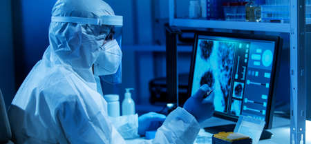 Doctor in protective suit is doing a science experiments and developing vaccine in a modern laboratory. Genetic engineers workplace. The concept of science and medicine.