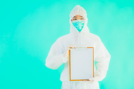 Portrait beautiful young asian doctor woman wear ppe or personal protective equipment for protect from coronavirus or covid19 with empty card white board on blue isolated background