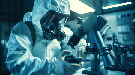 Expert surgeon in protective workwear and mask examines bacterium indoors generated by artificial intelligence