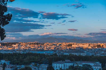 Overview of trees, cathedrals domes and roofs of buildings in the sunset of Rome, the incredible city of the Ancient Era, known as The Eternal City. Located in the Lazio region, central Italy