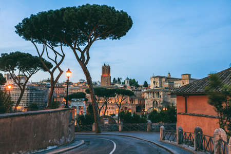 Rome, Italy - road near Roman Forum with stone umbrella pines