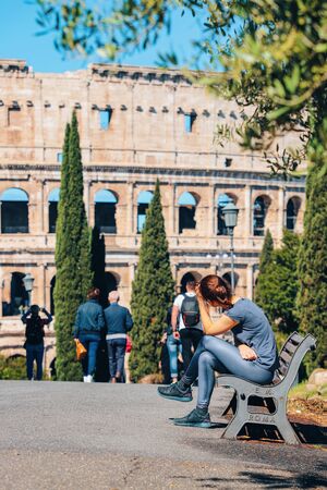 A girl sits on a Park bench and looks at the Colosseum in Rome.