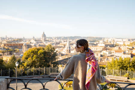 Woman enjoying beautiful morning cityscape of Rome, walking in Villa Borghese Park. Old fashioned woman wearing coat with colorful shawl in hair. Concept of italian lifestyle and travel