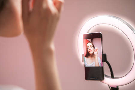 Beauty blogger recording makeup tutorial on phone camera