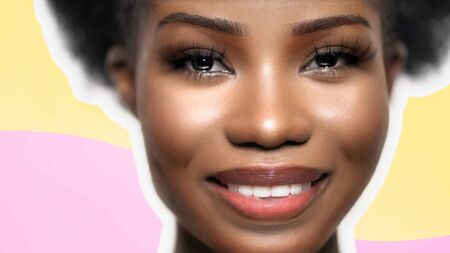 Attractive Smiling African Womans Face Isolated On Light Purple-Lime Color Background, Close Up Portrait of Cheerful Lady With Fresh Brown Skin In Beauty Concept