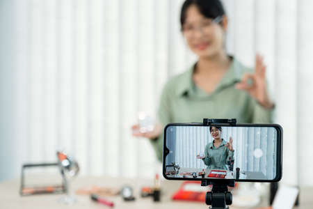 Asian woman beauty blogger or vlogger review cosmetic product Online influencer girl social media marketing.