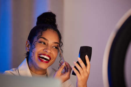 Pretty african american blogger applying mascara near mirror, gadgets and decorative cosmetics at home