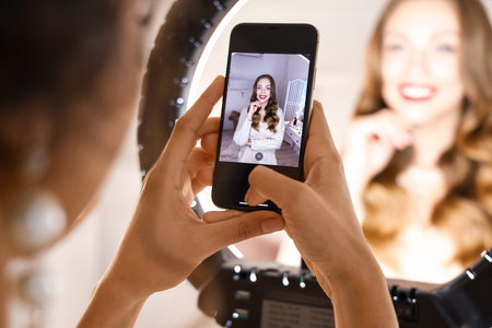 Blogger Woman Making Video For Beauty Blog Via Smartphone Indoor