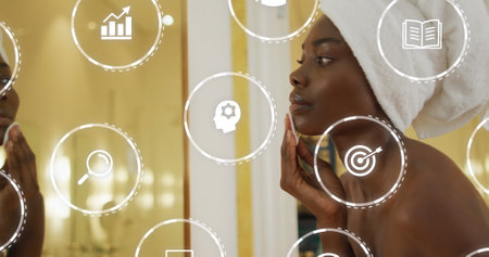 Image of icons over african american woman cleansing face in bathroom. Global lifestyle, self care and digital interface concept digitally generated image.