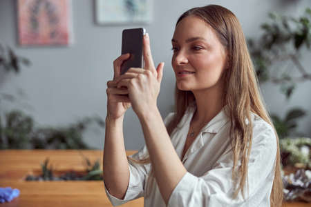 Confident female woman is taking photo on her smartphone