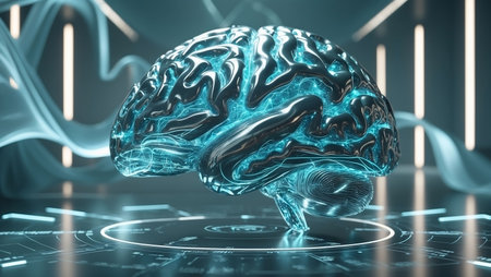This futuristic digital image features a glowing brain with intricate neural networks, symbolizing technology and science's impact on understanding human cognition and creativity.