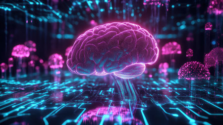 Neon digital brain in a futuristic circuit board environment. Brain glows with vibrant pink and blue hues, emphasizing technology and human intelligence. Concept of brainpower, neuroscience