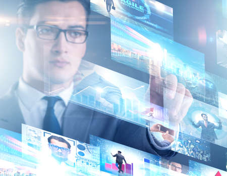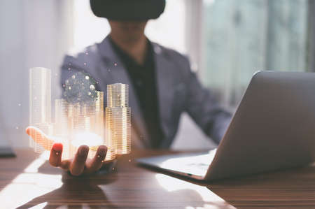 Contemporary digital business technologies. A business analyst manages business processes using virtual technologies. Digital holograms, charts.
