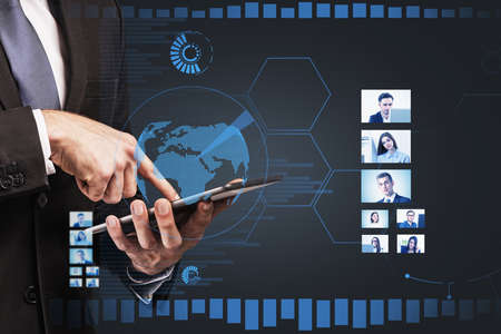 Businessman using tablet device, finance conference of business colleagues, a team communicating on the distance, digital hologram interface, earth map and circuit connections.