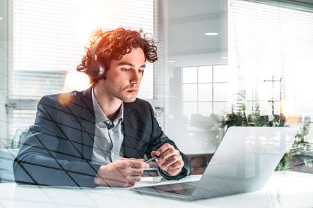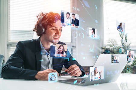 Handsome Hispanic businessman in formal suit sitting in front of laptop in headphones and carrying out finance conference of business colleagues, a team communication, digital hologram interface