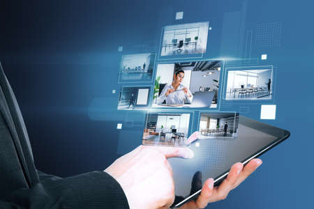 Close up of businessman hand pointing at tablet with creative digital picture gallery on blue background. Photo album and media technology concept. Switching images