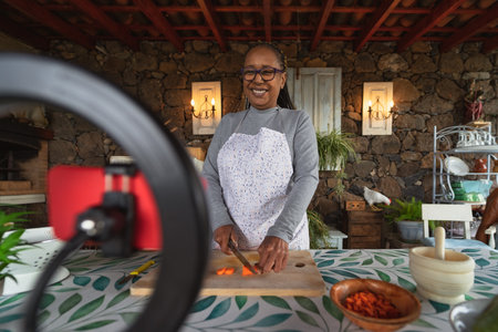 African senior woman preparing food recipe while streaming online with mobile smartphone cam for web kitchen masterclass channel