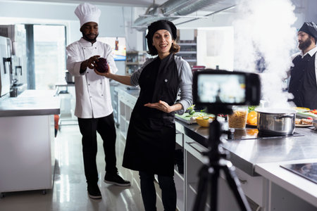 Authentic chef filming online cooking show in restaurant kitchen, explaining culinary recipe preparations. Female cook in uniform recording gastronomy video to make professional gourmet dish.