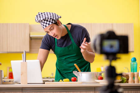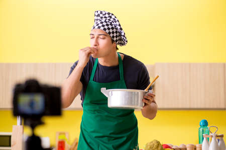 Young man cooking tasty rice while recording video tutorial in kitchen