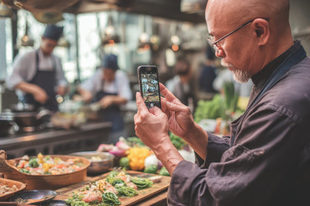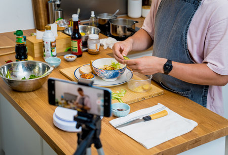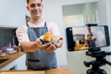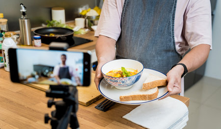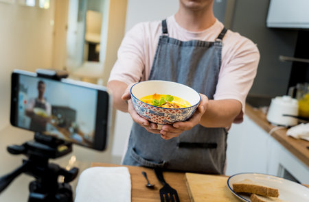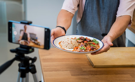Food content creator blogger camera phone blog social media, producing and sharing content related to food channels online outlets vlogging culinary meal cooking