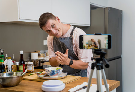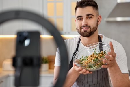 Food blogger cooking while recording video with smartphone and ring lamp in kitchen