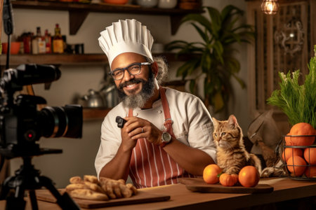Generative AI : Happy bearded man in glasses smiling and demonstrating ripe vegetables while shooting video for cooking vlog in kitchen at home