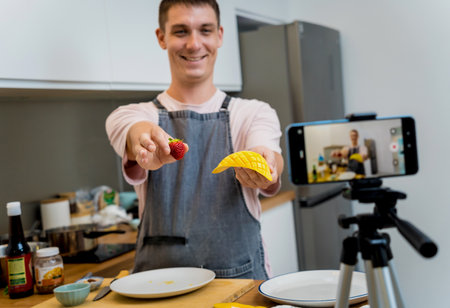 Man broadcasting a video blog about tasty and healthy food. Healthy lifestyle and social media