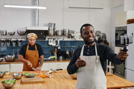 Waist up portrait of African-American man holding smartphone while recording videos or livestream in kitchen, copy space