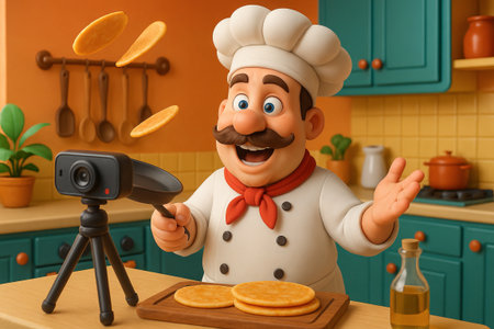 Animated chef hosting culinary stream and cooking pancakes in brightly colored kitchen. concept of cooking show, gastronomy, passion for cooking.