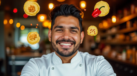 A cheerful chef stands confidently in a warmly lit restaurant, surrounded by floating elements like spices and ingredients, conveying a vibrant culinary atmosphere.