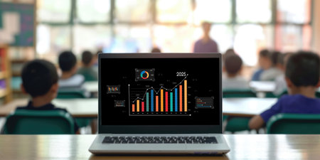 An interactive classroom scene shows students engaged with modern educational tools. Bright lighting illuminates the space, featuring a teacher guiding children near tables with computers and interactive surfaces. The environment promotes active learning with the use of advanced technology. Suitable for educational and commercial applications.